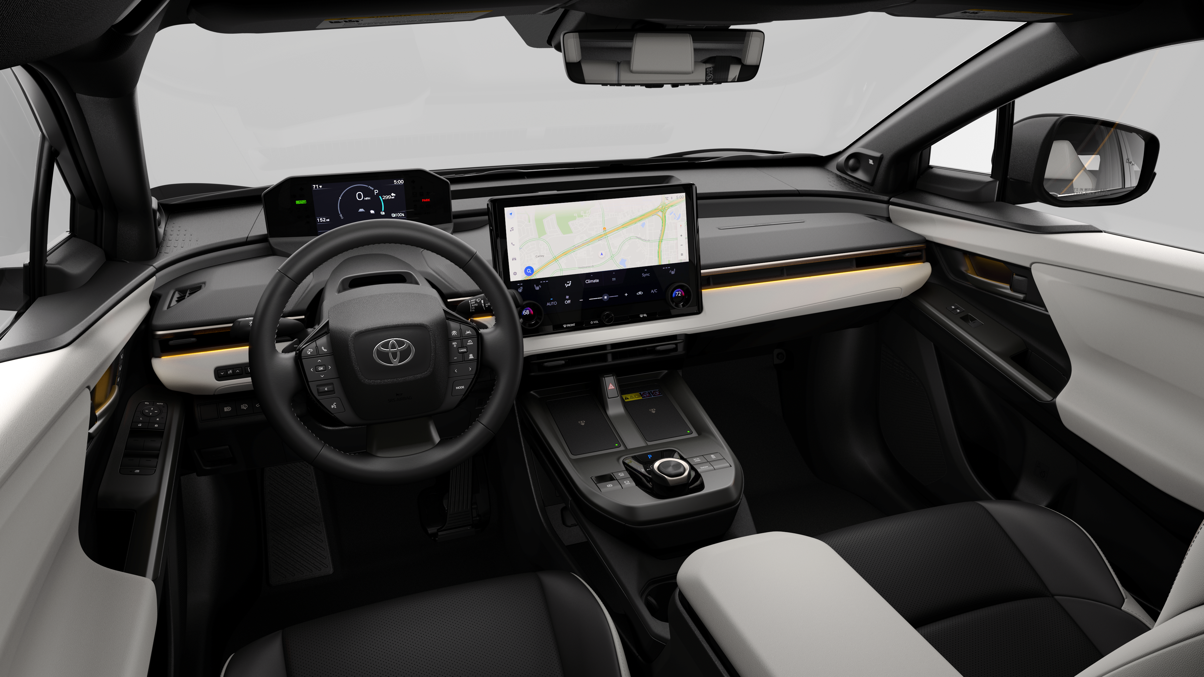 - Center console with covered storage compartment, two cup holders, two Qi-compatible wireless chargers and front lower storage tray
